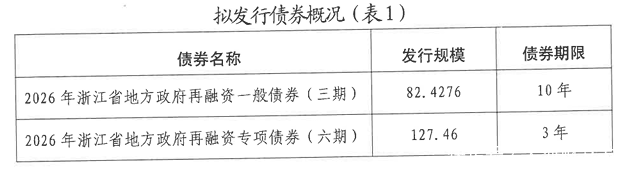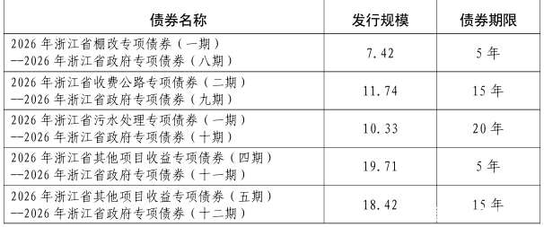 根据通知,本批债券为记账式固定利率附息债,共9期,计划发行面值总额457.7576亿元。其中,发行2026年浙江省地方政府再融资一般债券(三期)和再融资专项债券(六期)总额209.8876亿元,品种为记账式固定利率附息债券,期限为10年期和3年期。发行2026年浙江省政府专项债券(八至十四期)总额247.87亿元,品种为记账式固定利率附息债券,期限为5年期、15年期、20年期和30年期。
